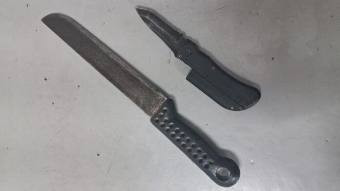 Com apoio de uma segunda viatura, os policiais adentraram a casa e encontraram o suspeito deitado em um dos quartos. Ele foi abordado e revistado, e embora nada de ilícito tenha sido encontrado, os policiais informaram que o rapaz apresentava comportamento desconexo e agitado. Uma faca de cozinha foi localizada no ambiente, reforçando os indícios de ameaça.