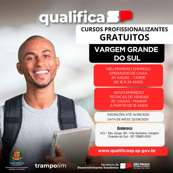 O Departamento de Desenvolvimento Econômico e do Trabalho da prefeitura de Vargem Grande, através do Posto de Atendimento ao Trabalhador (PAT) recebe a edição do programa Qualifica SP, em parceria com o Governo do Estado de São Paulo e Associação Comercial e Industrial da cidade (ACI). São ofertados cursos gratuitos de capacitação de jovens e adultos, visando ampliar oportunidades de qualificação profissional e fortalecimento da empregabilidade. As inscrições estão abertas até o dia 14 de setembro.