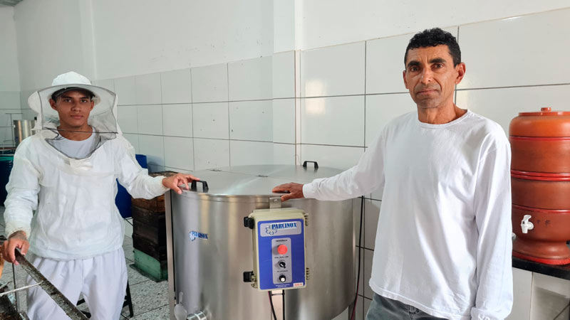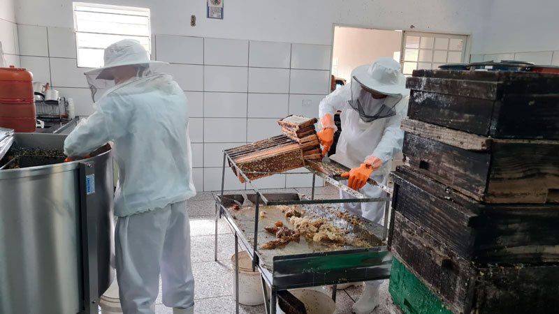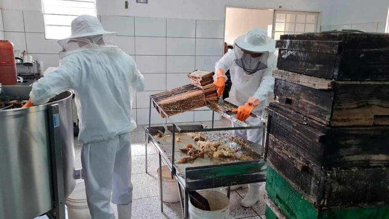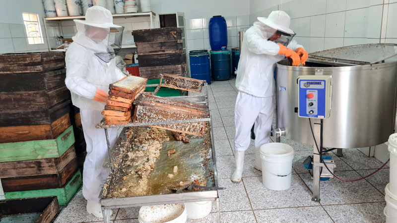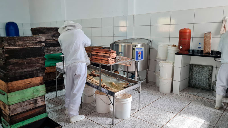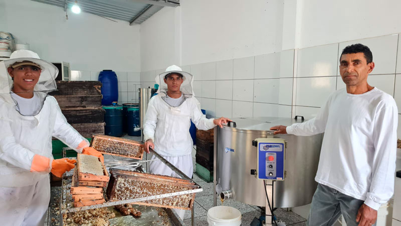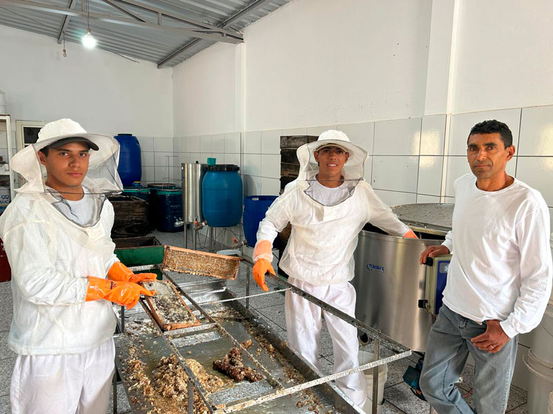 A estrutura é operada de forma familiar: enquanto Isaias realiza sozinho as colheitas nos apiários, a etapa de extração conta com o apoio de seu filho Hendrick Duarte de Anastacio e do funcionário Kaike Gabriel Eugenio Alves.