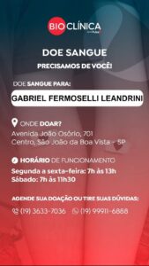 Para doar, a pessoa deve ir até São João da Boa Vista, na Avenida João Osório, 701, Centro. O horário de funcionamento é de segunda a sexta-feira, das 7h às 13h e aos sábados das 7h às 11h30. Maiores informações junto à família ou pelos fones: (19) 3633-7036 ou (19) 99911-6888.