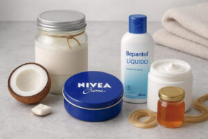 1 colher de chá do creme Nívea da lata azul, 1 colher de sopa de creme hidratante de sua preferência, 1 colher de café de óleo de coco ou óleo reparador de pontas, 1 tampinha de Bepantol líquido e 1 colher de chá de mel puro
