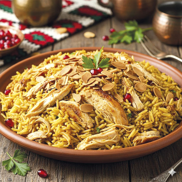 Ingredientes: 5 filés de peito de frango, 1 cebola cortada ao meio, 2 dentes de alho inteiros, cenoura, 1 talo de salsão, 1 litro de água, 1 folha de louro, 2 talos de salsinha, 1 colher (chá) de sal, 1 colher (sopa) de azeite extra-virgem, ½ cebola picada, 1 dente de alho picado, 1 xícara e meia de chá de arroz branco, cebolas caramelizadas, 2 colheres (sopa) de manteiga sem sal, 2 cebolas grandes cortadas em tiras, 2 colheres (sopa) de pimenta síria, 1 xícara (chá) de amêndoas sem pele laminadas e levemente tostadas