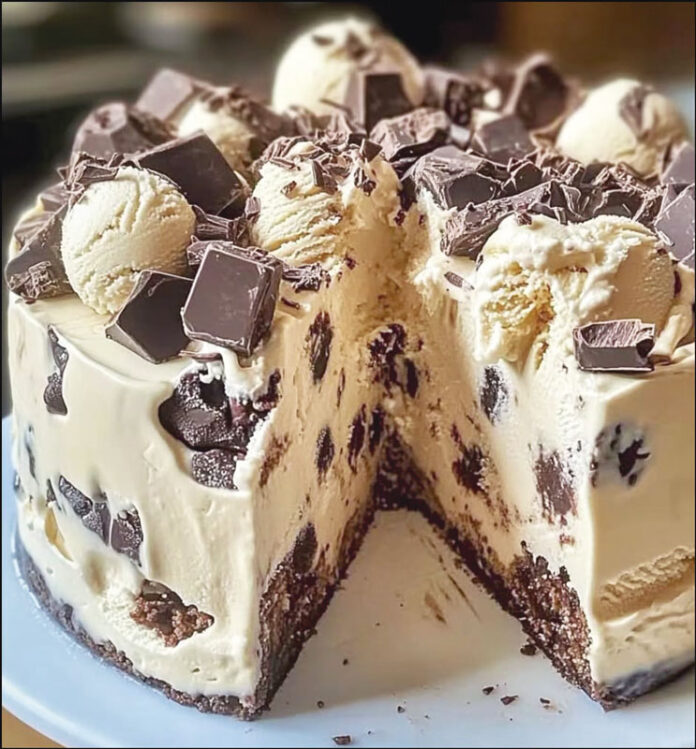 Para a base: 200 g de bolachas tipo Oreo sem o recheio ou de sua preferência e 100 g de manteiga derretida. Para o recheio: 1 litro de sorvete de creme ou a sua escolha, 150 gramas de chocolate meio amargo picado e 100 gramas de pedaço de brownie ou cookies (opcional). Para a cobertura: cubos e raspas de chocolate ao leite ou meio amargo. Bolas de sorvete para decorar.