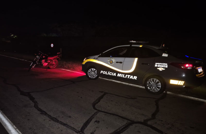 No final da noite da segunda-feira, 5 de janeiro, a equipe do Policiamento Rodoviário estava em deslocamento quando visualizou uma motocicleta e, seu condutor ao perceber que seria abordado, dispensou um objeto no acostamento.