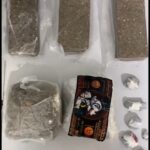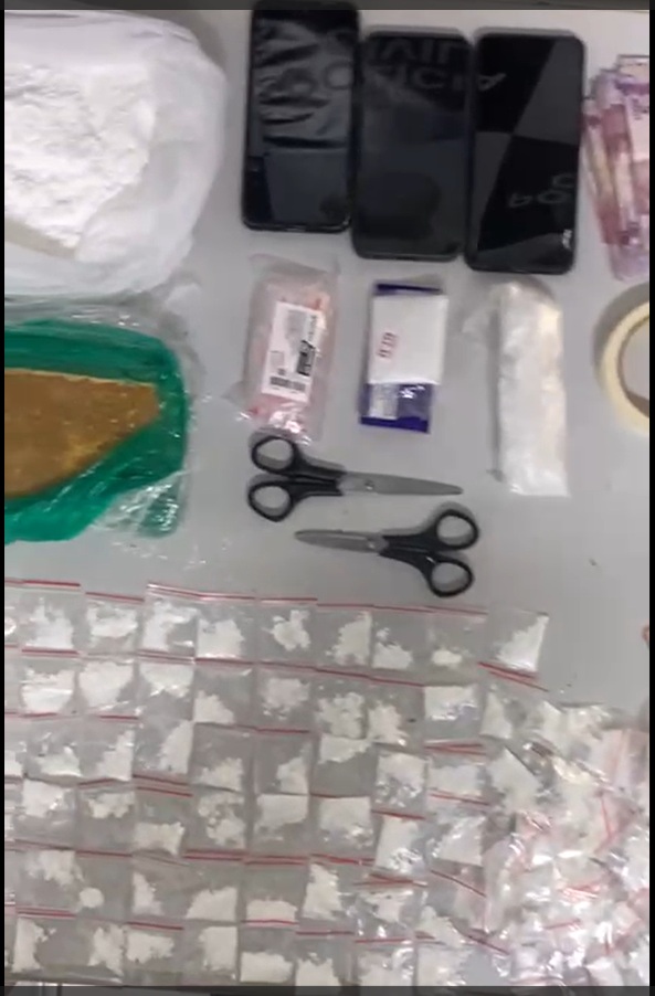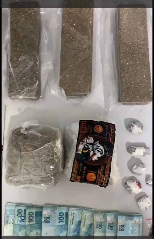 Dentro de um armário na cozinha, os policiais encontraram 98 porções de cocaína, uma porção a granel de cocaína, seis porções de maconha, duas tesouras, um rolo de fita crepe, 1 rolo de fita transparente, uma balança de precisão, três pacotes de embalagens plásticas e dois celulares. Já em um guarda-roupas, a equipe encontrou uma pochete com 1 porção de maconha, R$ 2.930,00 em cédulas diversas.
