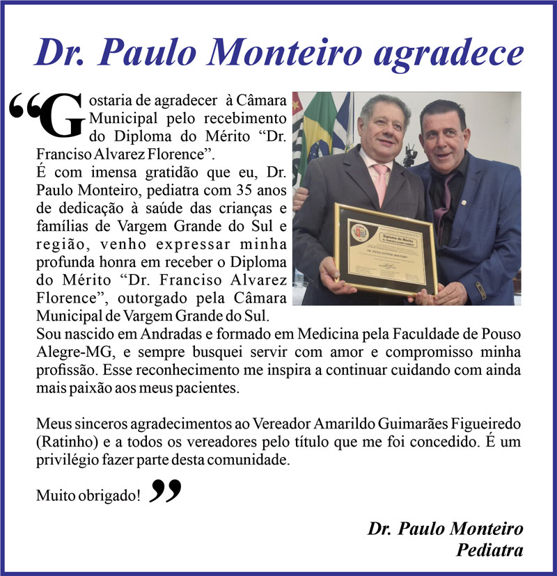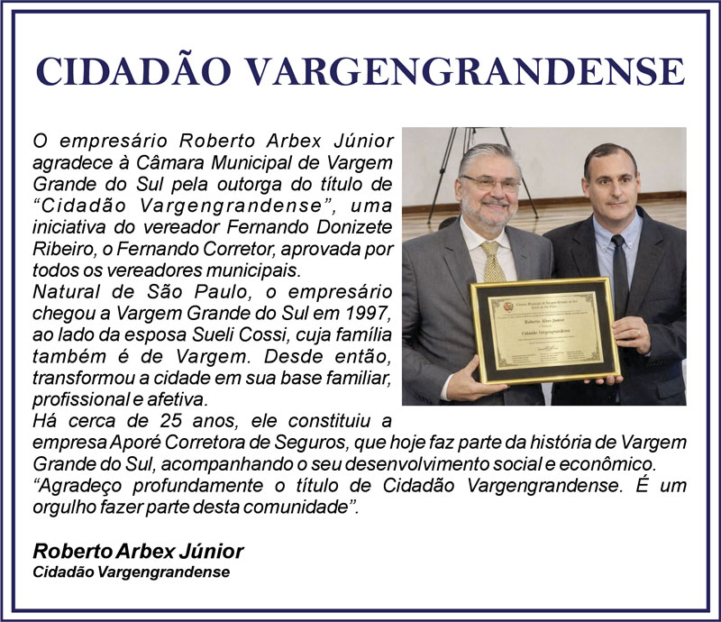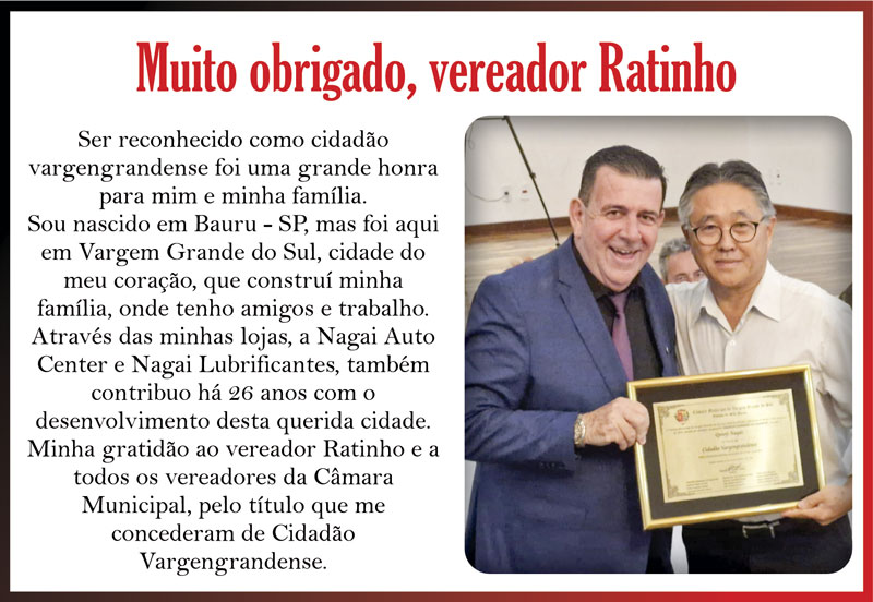 Deputado estadual Jorge Xerife do Consumidor, que recebeu o título de Cidadão Vargengrandense também não pode comparecer e enviou mensagem que também foi lida aos presentes, agradecendo a honraria, afirmando que o título reforça sua responsabilidade junto ao município. “Contem sempre com o Xerife do Consumidor, agora e sempre, Cidadão de Vargem Grande do Sul”, afirmou. O deputado ainda relacionou emendas e indicações direcionadas à cidade.
