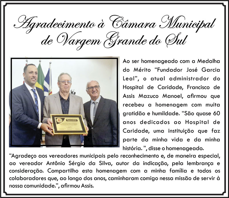 O legislativo também concedeu, em 2025, duas homenagens especiais. Uma delas foi em celebração dos 100 anos do Hospital de Caridade, que foi entregue em sessão solene realizada em 13 de maio. Já em julho passado, foi entregue uma placa comemorativa aos 70 anos da chegada da Congregação das Irmãs Franciscanas da Penitência à Sociedade Humanitária. Na ocasião, também foi entregue o Diploma de Mérito Dr. Francisco Álvares Florence à irmã Aparecida Donizete de Freitas.