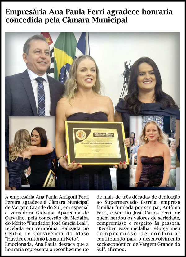 O Poder Legislativo de Vargem Grande do Sul realizou, na noite da última sexta-feira, dia 6 de fevereiro, uma sessão solene para a entrega de títulos e honrarias a cidadãos que se destacaram por suas contribuições ao desenvolvimento do município. Os homenageados, seus familiares e amigos, além de autoridades públicas municipais, participaram da solenidade, realizada no Centro de Convivência do Idoso Haydeé e Antônio Longuini Neto, antigo Clube Vargengrandense.