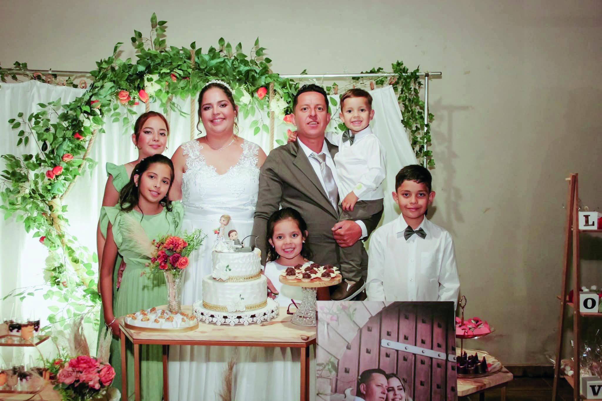Ao lado da esposa Jenifer, o pedreiro Júlio César Guimarães Arnaldo comemora mais um ano de vida, na quinta dia 26, quando recebe o abraço dos filhos Maria Luiza, Ana Clara, Lorenna, Carlos, Daniel e Miquéias, dos pais Clarice e Luiz Carlos, dos sogros, irmãos, sobrinhos, demais familiares e amigos