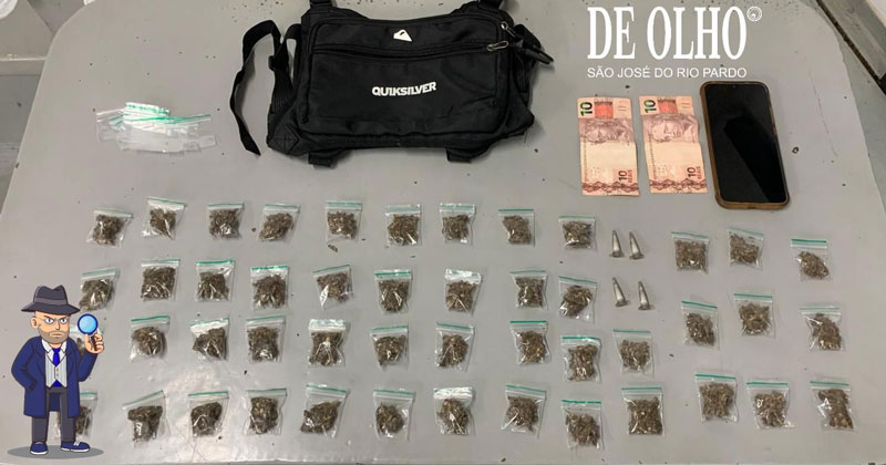 Ao todo, foram apreendidas 47 porções de maconha, quatro pinos com cocaína, além de materiais relacionados ao tráfico de drogas.