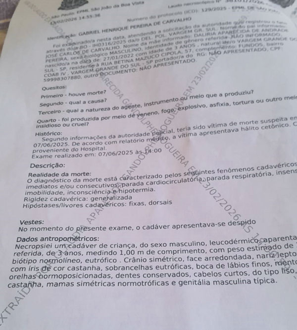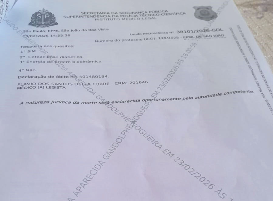 O laudo, que foi apresentado à Gazeta pela mãe do menino, assinado pelo médico legista Flavio dos Santos Della Torre, apontou que a causa da morte foi glicemia muito alta, levando a complicações metabólicas, caracterizadas como cetoacidose diabética.