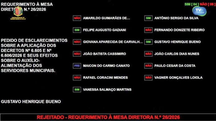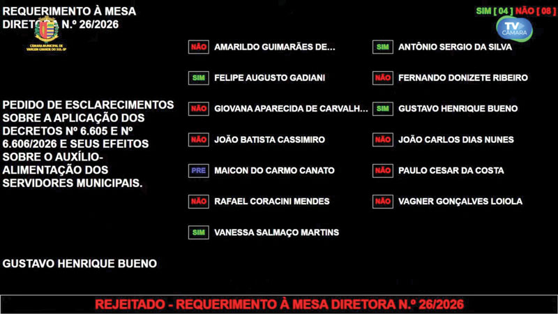Após uma discussão de mais de 40 minutos, o requerimento acabou rejeitado, com votos contrários de Ratinho (Pode), Giovana Carvalho (MDB), Parafuso (PSD), Rafael Coracini (MDB), Fernando Corretor (Republicanos), Joãozinho (Republicanos), Paulinho da Prefeitura (Podemos) e Bilu (Solidariedade). Os votos favoráveis foram de Felipe Gadiani (PSD), Vanessa Martins (PL), Serginho da Farmácia (Cidadania) e Gustavo Bueno (PL).