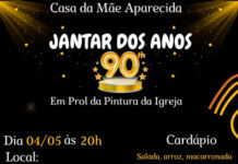 O Jantar dos Anos 90 em prol da pintura da Igreja Matriz de Nossa Senhora Aparecida acontecerá no próximo sábado, dia 4 de maio. O evento será às 20h, no Centro Pastoral Pe. Donizetti.