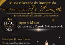 Neste domingo, dia 14, será celebrada a missa e a benção da imagem do Bem-Aventurado Padre Donizetti pelo padre Antônio Carossi na Capela do Padre Donizetti às 8h, no Sítio Morandin, local aonde a imagem chegou.