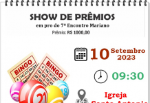 O Show de Prêmios em prol do 7º Encontro Mariano será neste domingo, dia 10. O evento tem início às 9h30 na Igreja Santo Antônio e o prêmio é de R$ 1 mil.