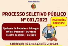As inscrições para o Processo Seletivo Público nº 001/2023, para contratação temporária dos empregos de Ajudante de Pedreiro, Oficial Pedreiro e Mestre de Obras terminam nesta segunda-feira, dia 14. O período de inscrições iniciou no dia 28 de julho.