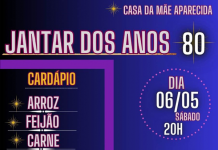 A paróquia Nossa Senhora Aparecida fará um Jantar do Anos 80 no dia 6 de maio, um sábado, às 20h. O evento será no Centro Pastoral Padre Donizetti. No cardápio, haverá arroz, feijão, carne, macarronada, salada e...