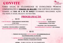 O Fundo Social de Solidariedade de Divinolândia promoverá, nesta semana, comemorações à Semana da Mulher, com sorteios de brindes. Entre segunda-feira, dia 6, e quarta-feira, dia 8, o Dia da Mulher, haverá ações voltadas à saúde, beleza...