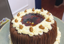 Bolo de chocolate com doce de leite e ameixa do Kadu Barros