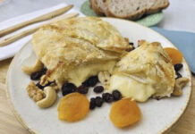 150 gramas de queijo brie congelado, 200 gramas de massa folhada congelada, mel a gosto, manteiga ou ovo para pincelar, frutas secas a gosto, castanhas a gosto e nozes a gosto.Modo de Preparo