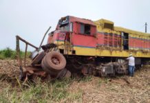 Um acidente na manhã de sábado envolvendo uma locomotiva e um caminhão bitrem carregado de cana de açúcar resultou em grande prejuízo.