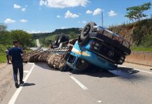 Caminhão tomba no trevo da mina e pista é interditada