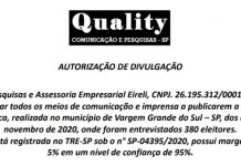 A Quality Pesquisas e Assessoria Empresarial Eirelli, CNPJ 26.195.312/0001-91, com sede em São Paulo, autorizou os meios de comunicação de Vargem Grande do Sul a publicar a pesquisa de opinião pública realizada no município entre os dias...