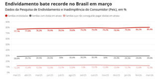 O percentual de famílias brasileiras endividadas atingiu 80,4% em março, o maior nível já registrado na série histórica da Pesquisa de Endividamento e Inadimplência do Consumidor (Peic), divulgada pela Confederação Nacional do Comércio de Bens, Serviços e Turismo (CNC)....